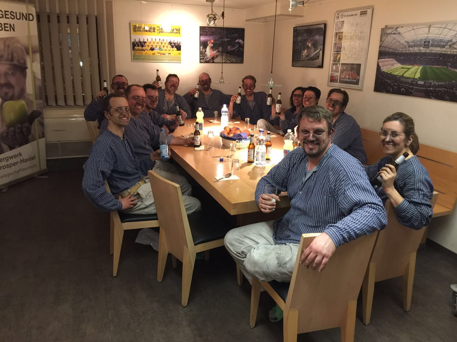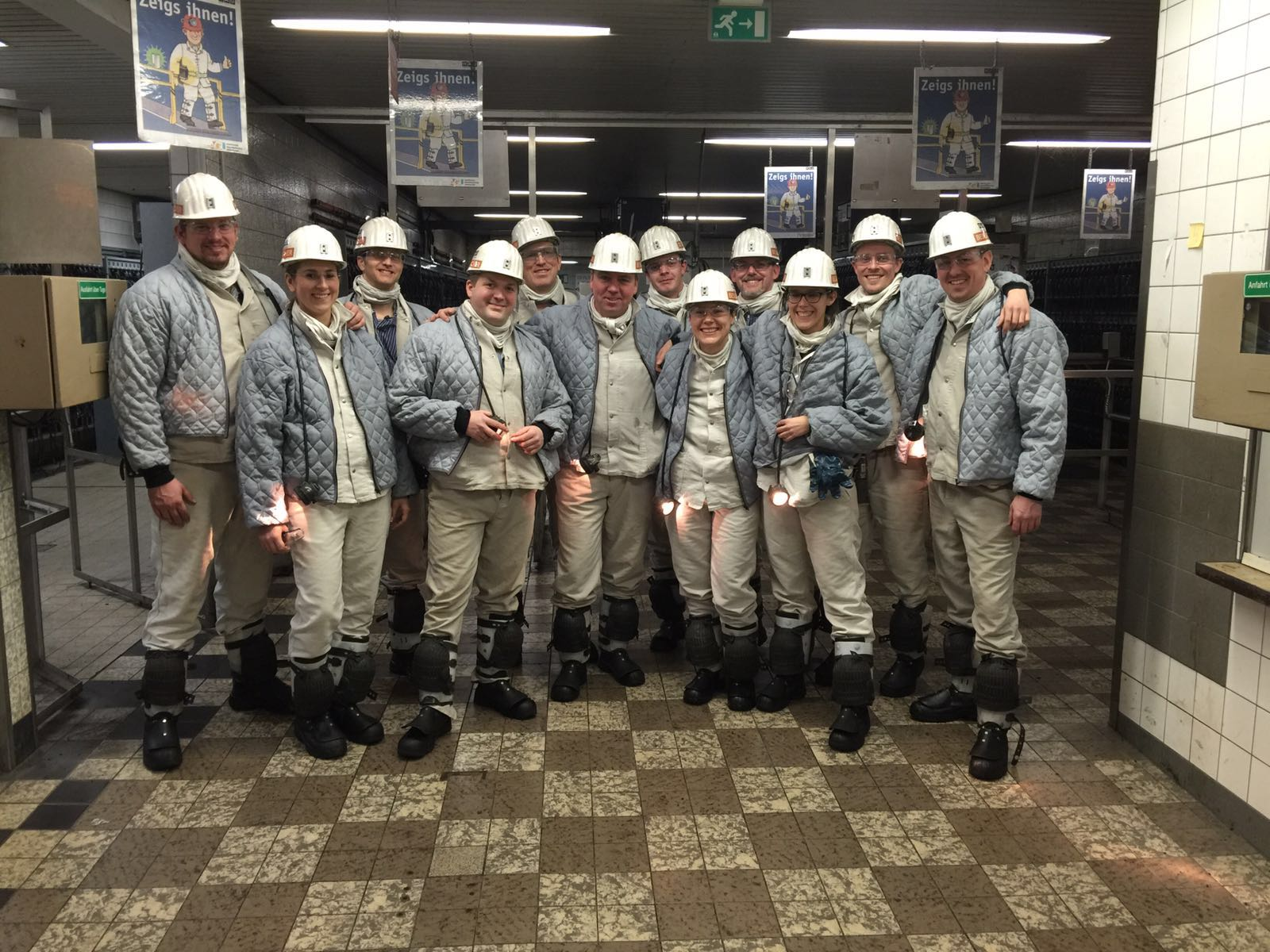 Begeistert und fröhlich sind diese Woche 12 Wirtschaftsjunioren aus Essen in das Bergwerk Prosper-Haniel eingefahren. Begleitet wurden sie vom Bergmann Uwe, der mit seiner direkten Art ihnen humorvoll das 1X1 des Steinkohlenbergbaus erklärt hat. Frei nach dem Motto “Wer die Kohle möchte, muss hart malochen!” scheuten sie weder Schmutz noch Staub, um an das begehrte schwarze Gold zu gelangen. Abschließend wurden bei einem stärkenden Eintopf die letzten verbliebenen Fragen zum Steinkohlenbergbau geklärt.